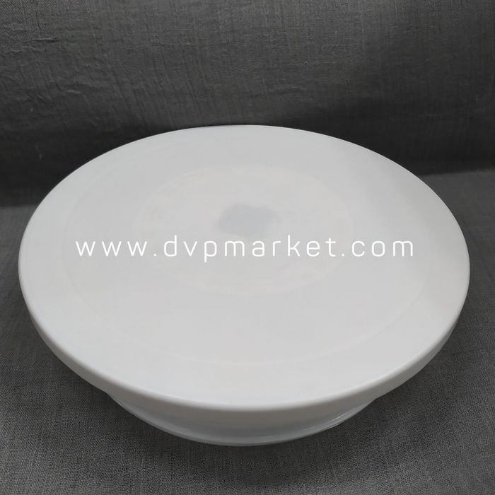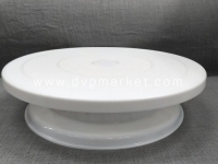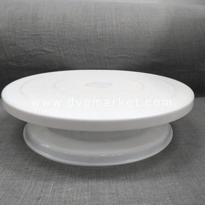 Bánh sau khi nướng trông sẽ khá đơn điệu và không hấp dẫn. Chính vì vậy, các thợ làm bánh nên trang bị một chiếc bàn xoay để hỗ trợ việc đặt và trang trí, tô điểm bánh. Bàn xoay gồm 2 phần là chân xoay và mặt bàn được làm bằng nhựa, có màu trắng, kiểu cách đơn giản, không chứa chất độc hại. Bàn xoay có đường kính mặt là 28cm, đường kính đáy 23,5 cm và cao 7cm. Nhìn tổng thể bàn khá chắc chắn và có độ bền cao.