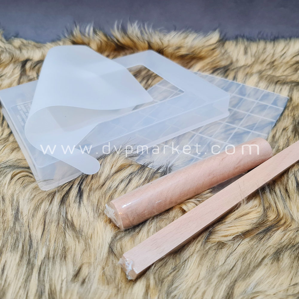 Bộ dụng cụ bao gồm: khuôn nhựa, thanh cán gỗ, thanh lăn gỗ và tấm silicon giúp cho ko bị dính kẹo vào thanh gỗ