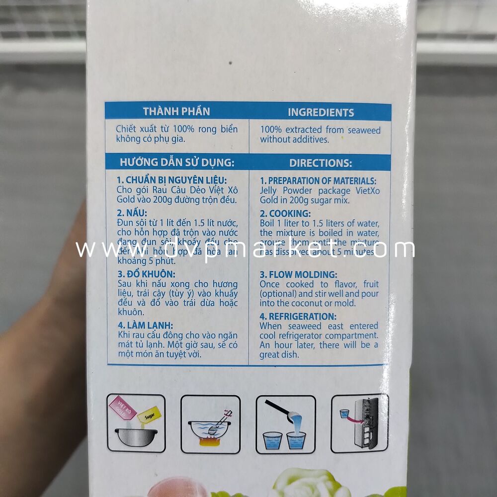 Cách sử dụng đơn giản: Cho nước đun sôi 1 gói bột rau câu, trộn chung với đường, sôi khoảng 2-3 phút tan đều, nhắc xuống bếp rồi đổ vào chén khuôn, kết hợp với các loại hương vị trái cây tùy thích. Nên bảo quản nơi khô ráo, thoáng mát, tránh ánh nắng trực tiếp. Sản phẩm bột rau câu dẻo Việt Xô chất lượng, giá cả tốt tại DVP Market sẽ giúp bạn dễ dàng chế biến các món thạch rau câu mát lành yêu thích của mình. Ngoài ra còn có các loại nguyên liệu pha chế khác cho các bạn lựa chọn và sử dụng.