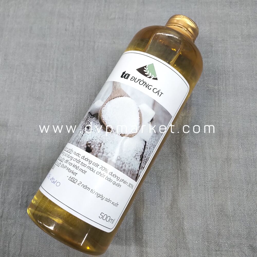 Đường cát nước 0.5l được chiết xuất tự nhiên với nguyên liệu chính là 70% những hạt đường cát trắng mịn kết hợp với một số thành phần nguyên liệu khác để nấu đường lên nóng chảy.