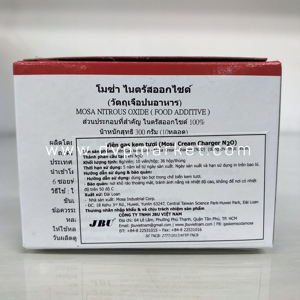Gas N2O Mosa là sản phẩm được sản xuất bởi thương hiệu Mosa của Đài Loan. Sản phẩm có kích thước nhỏ, lớp vỏ ngoài làm bằng chất liệu inox không gỉ. Mỗi viên có khối lượng 8gram, một hộp có 10 viên bảo quản trong hộp giấy sử dụng trong vòng 5 năm.