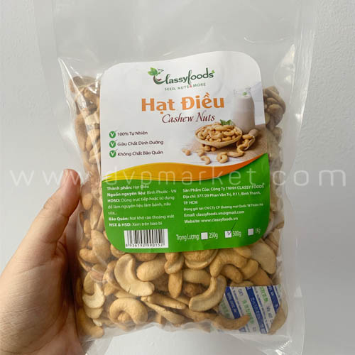 Là loại hạt có nhiều chất dinh dưỡng và đặc biệt rất tốt cho tim mạch. Hạt điều được sản xuất và chọn lọc kỹ càng với công nghệ hiện đại đã được rang chín. Sản phẩm cho ra những hạt to, đều, có vị bùi khi ăn, hạt có màu vàng. Thành phần hoàn toàn 100% từ tự nhiên, đảm bảo an toàn tuyệt đối cho sức khỏe người dùng.