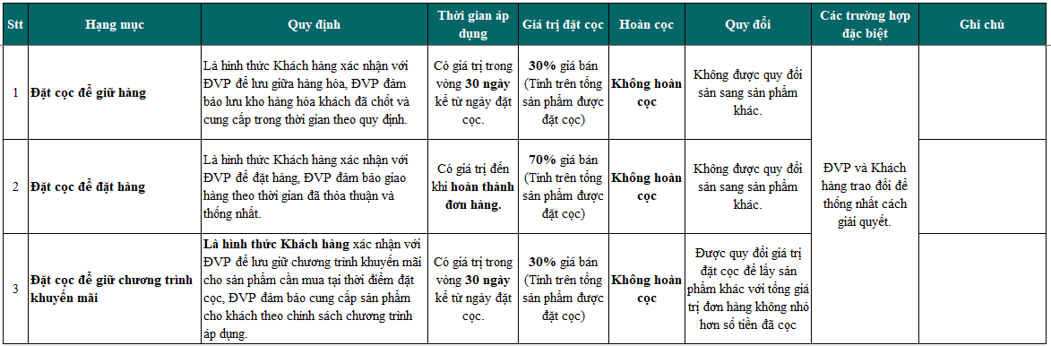 Nhằm đảm bảo tính xác thực của đơn hàng, với những đơn hàng giá trị lớn sẽ được yêu cầu đặt cọc một phần, phần còn lại sẽ được thanh toán khi nhận hàng.