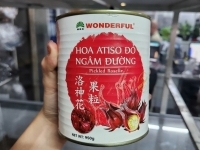 Hoa atiso được ngâm với nước đường, sản phẩm bao gồm cả cái lẫn nước có vị chua chua, ngọt, kích thích vị giác khi dùng