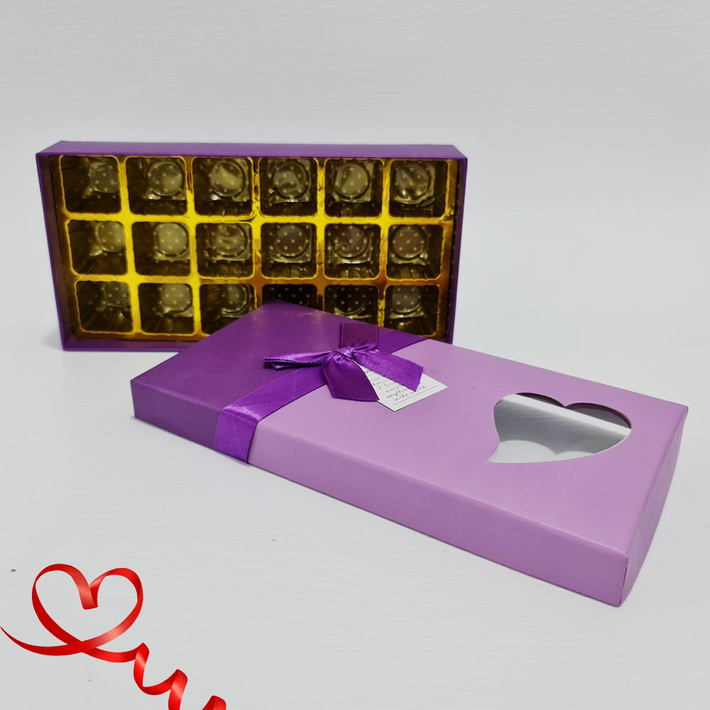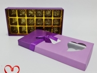 Hộp socola chữ nhật 18 ngăn mặt kính màu tím nơ tím