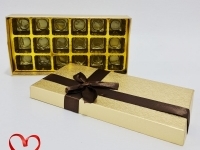 Hộp socola chữ nhật với chất liệu từ giấy cao cấp, có độ cứng cáp, chắc chắn với thiết kế 18 ngăn đựng những viên kẹo socola. Nắp hộp đựng vừa khít với miệng hộp giúp bảo quản được thành phẩm được tốt. Hộp được thiết kế với tông màu vàng sang trọng có điểm nhấn nơ nâu tinh tế rất thích hợp làm quà tặng cho người thương đặc biệt là những ngày lễ Valentine.