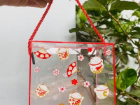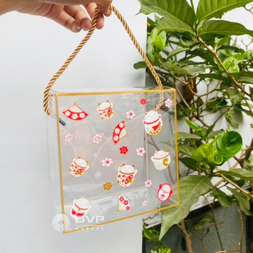 Một chiếc hộp nhựa trong suốt có quai xách size 16.5x8.5x15 với họa tiết hình con Mèo thần tài, phát lộc dùng để đựng các loại hộp bánh, kẹo,… dùng làm quà tặng cho người thân yêu, mang may mắn đến cho mọi nhà.