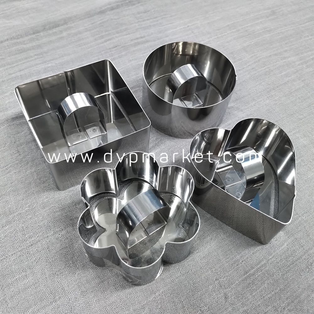 Đây được làm từ chất liệu inox cao cấp, có độ bền cao, chống bị gỉ, dày dặn, không bị vỡ và an toàn cho người sử dụng. Đặc biệt được thiết kế thêm phần có nắp đậy chắc chắn, dễ cầm nắm và dễ sử dụng. Sản phẩm bao gồm 4 loại hình mẫu: hình bông hoa, hình tròn, hình trái tim, hình vuông. Khuôn không có đáy nên dễ lấy ra khỏi khuôn, tạo hình khuôn vừa vặn, không bị vỡ bánh, dáng bánh đều và đẹp.