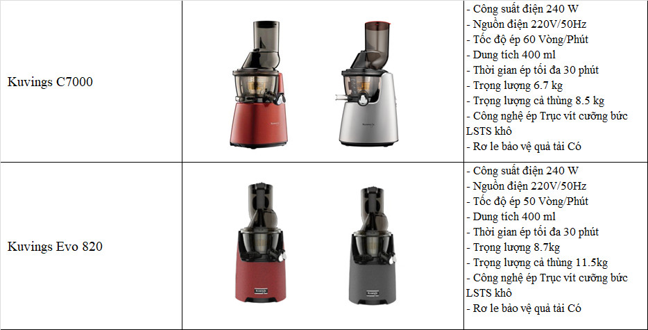 - Máy ép trái cây tốc độ chậm hiệu Kuvings với dung tích 400ml được sản xuất từ linh kiện cao cấp có độ bền cao và nhựa không chứa chất độc hại. Tốc độ ép của Kuvings Evo 820 chỉ 60 vòng/phút. So với máy ép thông thường. Sản phẩm cho ta thấy lượng nước ép có được từ máy Kuvings nhiều gấp 1,5 lần cho ra màu sắc nước ép rất tự nhiên, đậm đặc hơn mang lại giá trị dinh dưỡng cao.