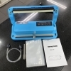 Bước 1: Cấp nguồn, ấn nút on/off để khởi động máy. Nâng nắp máy lên trên. Lựa chọn thời gian hàn, phụ thuộc vào chiều dày của túi, trong khoảng từ 1 đến 10s. Ấn nút Suction nozzzle để đẩy ống hút ra ngoài.