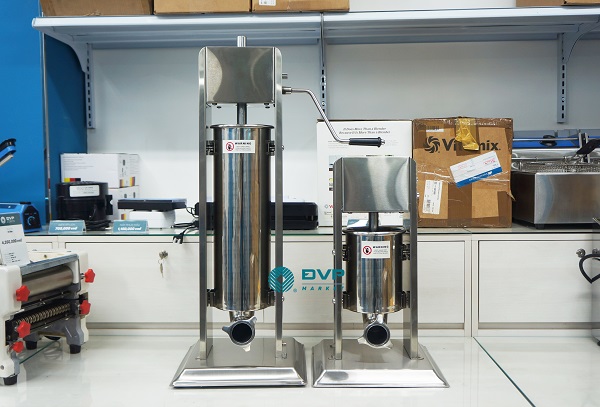 Tùy theo từng máy mà cối đựng thịt có dung tích khác nhau, có loại 3L, có loại 7L. Phần khung máy được làm chắc chắn,g. Mỗi máy còn có phụ kiện đi kèm gồm 4 phễu đùn với kích thước khác nhau phù hợp với nhu cầu khác hàng. Các bộ phận của máy dễ dàng tháo lắp sử dụng và vệ sinh. Sản phẩm sử dụng lực ép để nhồi nguyên liệu đã xay nhuyễn qua các khuôn làm xúc xích, lạp xưởng, nem, chả,… Các đầu ra thiết kế vừa vặn giúp không khí không bị lọt vào bên trong, góp phần bảo quản sản phẩm lâu hơn mà không bị hư hỏng hoặc oxy hóa. Với máy dung tích 7L có thể làm được 5kg/ mẻ, máy dung tích 3L làm được 1,5 – 2kg/ mẻ.