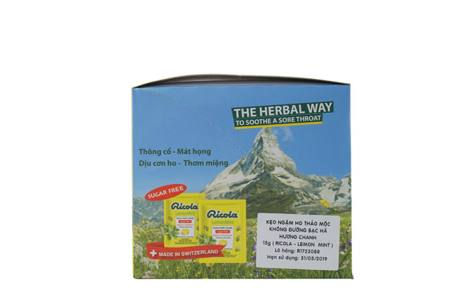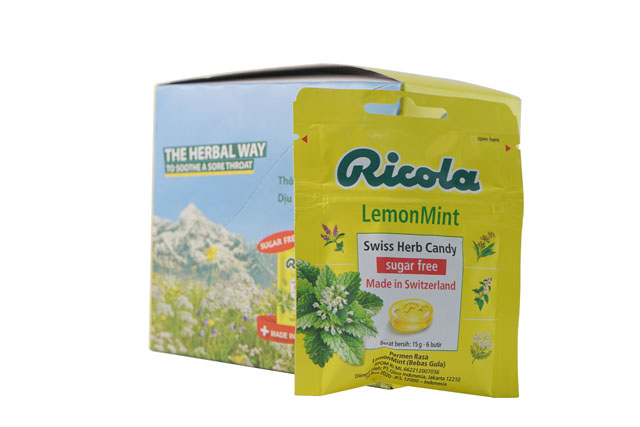 Kẹo ngậm thảo mộc Ricola Sachet Lemon Mint 15g chiết xuất tự nhiên, là sự kết hợp và hòa quyện giữa 13 loại thảo mộc quý ở vùng núi Thụy Sĩ. Đây là loại kẹo thảo mộc không chứa đường có thành phần chủ yếu là chanh, lá bạc hà, siro glucose, axit citric, hỗn hợp thảo mộc ricola. Ricola Sachet Lemon Mint 15g sản xuất trên dây chuyền công nghệ hiệ đại, khép kín đạt tiêu chuẩn cao, không có chất độc hại và an toàn với sức khỏe khi sử dụng.