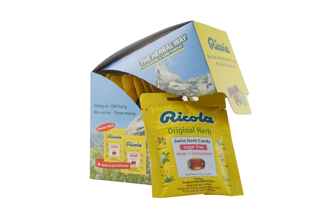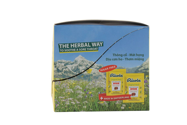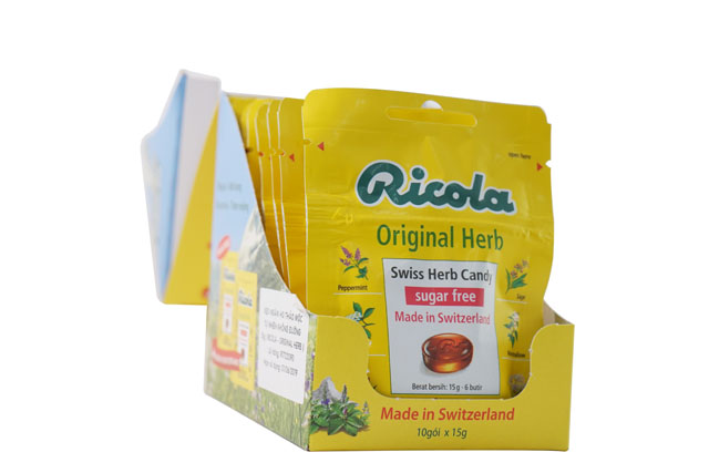 Ricola Sachet Original Herbs 15g là tên một loại kẹo ngậm thảo mộc không đường rất tốt cho sức khỏe. Sản phẩm nổi tiếng còn bởi sự kết hợp và hòa quyện của 13 loại thảo mộc quý hái trên vùng núi Thụy Sĩ. Thành phần chính của kẹo bao gồm đường, siro glucose, axit citric, chiết xuất tinh dầu trái chanh và hỗn hợp thảo mộc ricola, hương liệu tự nhiên. Ricola Sachet Original Herbs 15g sản xuất theo dây chuyền hiện đại, các khâu chế biến khoa học, rõ ràng giúp đảm bảo chất lượng, không có chất độc hại đảm bảo an toàn sức khỏe.