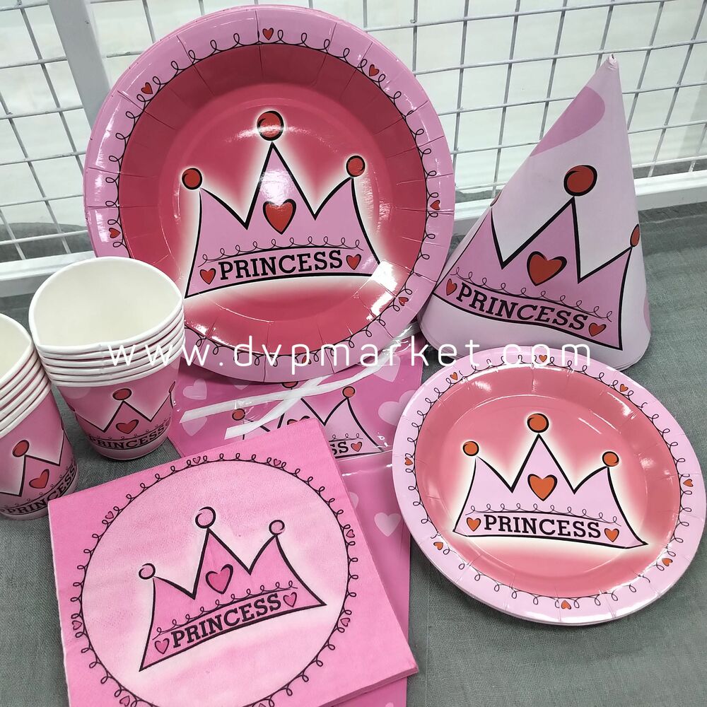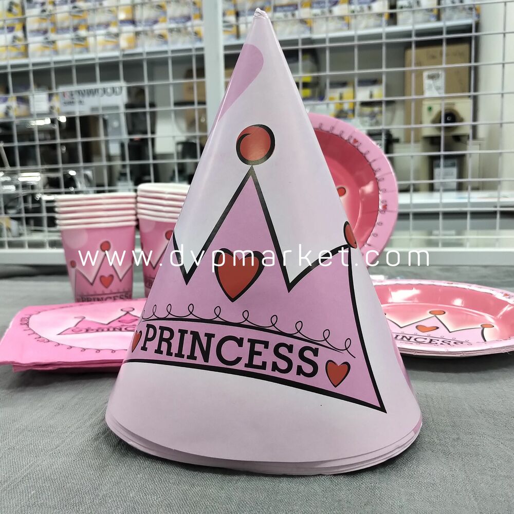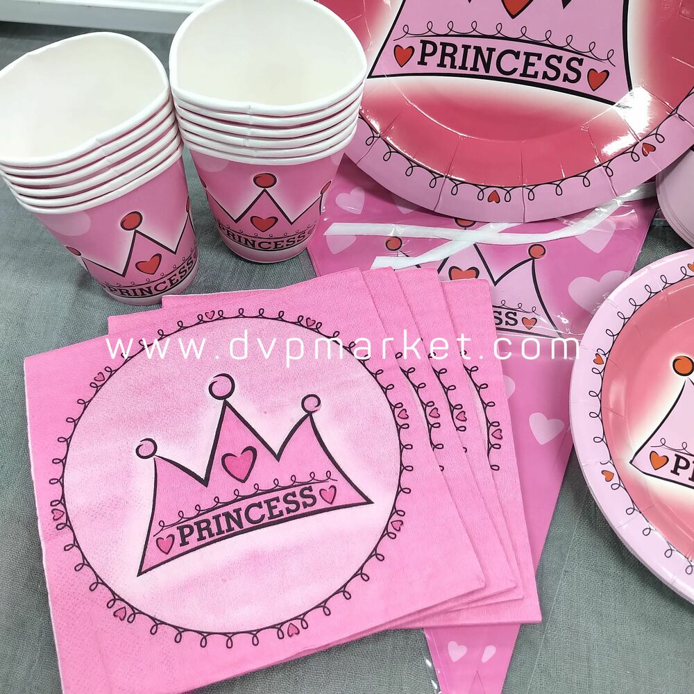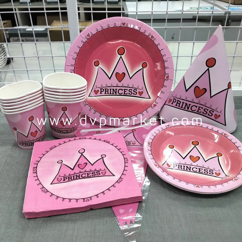 Bộ set sản phẩm gồm có 6 loại món khác nhau: mũ giấy, cốc uống nước, đĩa lớn, dĩa nhỏ, dây cờ, khăn giấy. Sản phẩm được làm bằng giấy cứng cao cấp in màu sắc nét, tươi vui, an toàn cho sức khỏe. Set trang trí tiệc được in theo chủ đề Princess với họa tiết dễ thương, tông màu chủ đạo là hồng sẽ khiến cho các bé rất thích.