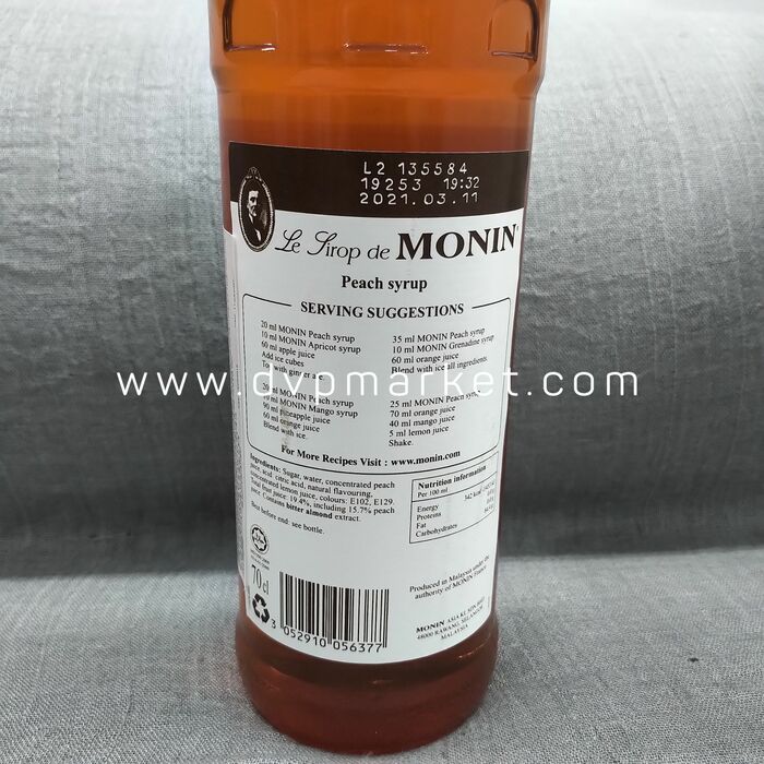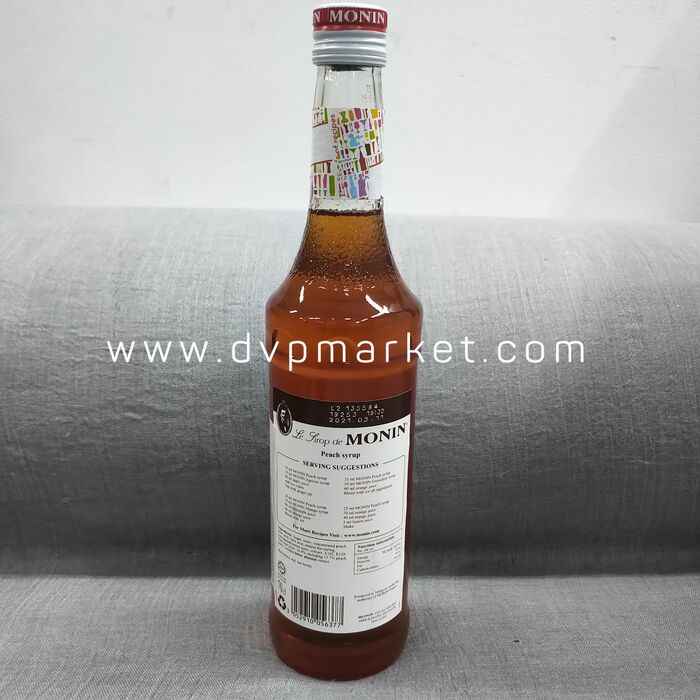 Làm từ những trái đào tươi ngon kết hợp cùng vị ngọt ngào của đường mía tinh luyện,Syrup Monin Peach 700ml là nguyên liệu vô cùng tiện lợi để bạn pha chế thật nhiều thức uống. Đặc biệt, các bartender thường dùng loại siro này pha chế cafe, soda, trà, đồ uống đá xay, cocktails, mocktails,... Chỉ cần nhớ công thức 1:7 (1 phần siro đào, 7 phần nước) kết hợp chút đá bào là bạn cũng có thể tự pha cho mình những món đồ uống thật ngon ngay tại gia đình mình.