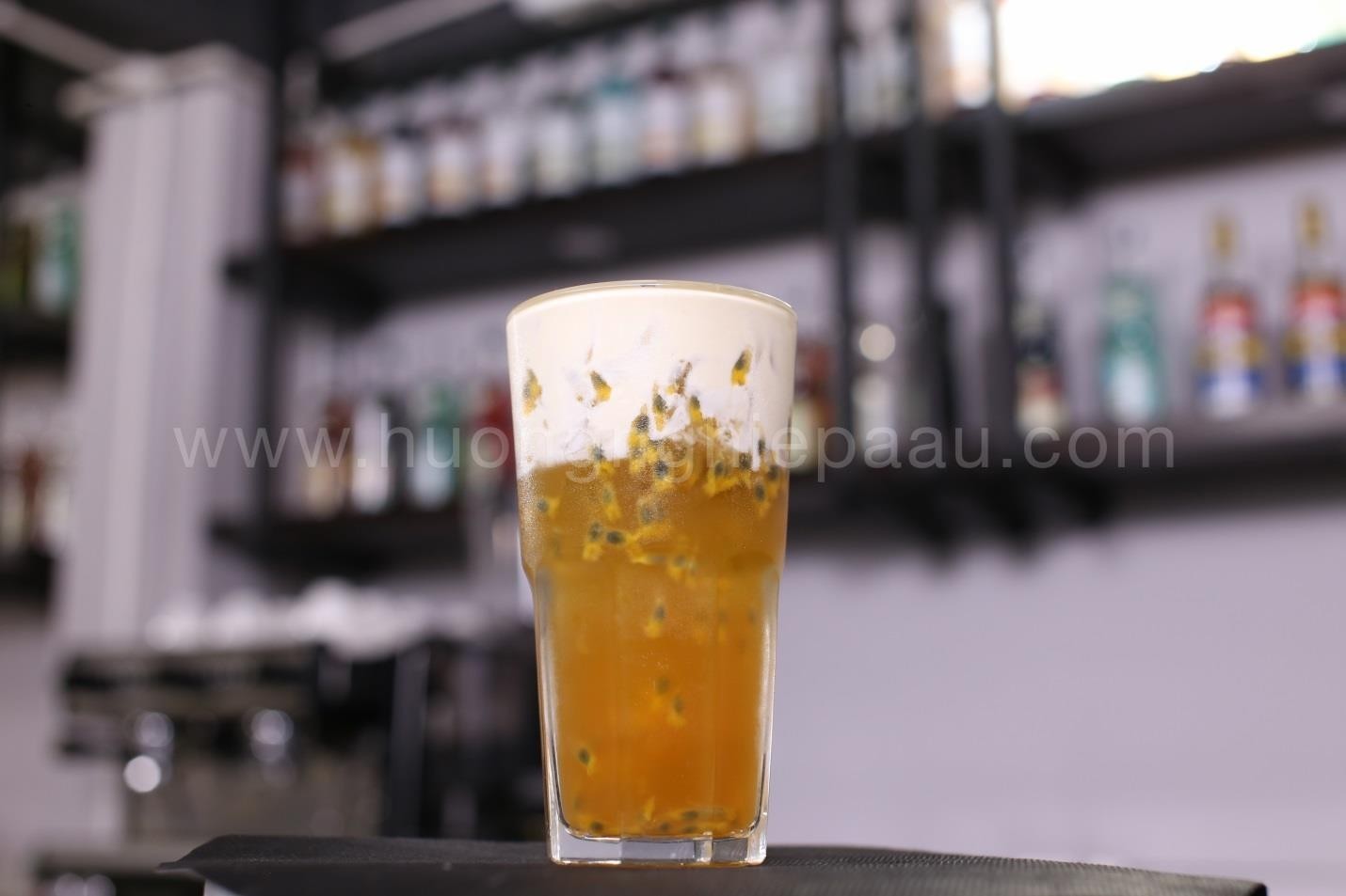 - Bước 3: Cho 100ml cốt lục trà + 25ml sinh tố chanh dây + 20ml nứơc đường. Khuấy đều, cho đá vào gần đầy ly và rót Macchiato lên trên mặt là hoàn thành.