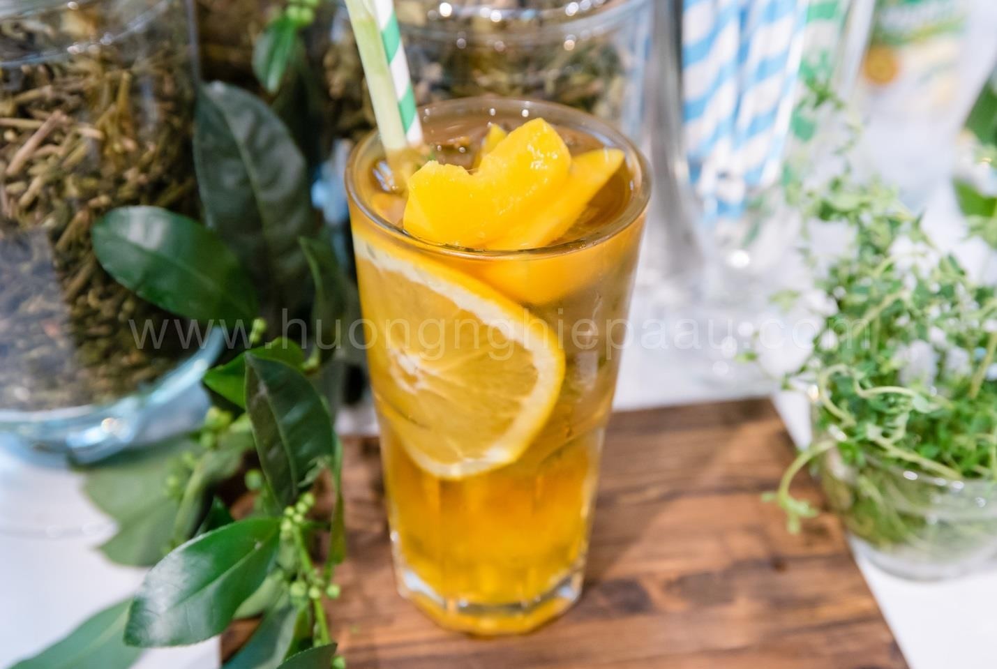 - Bước 1: Cam: cắt lát mỏng để trang trí, vắt lấy 20ml nước cốt - Sả: đập dập, cắt mỏng và đun sôi - Đào: cắt miếng