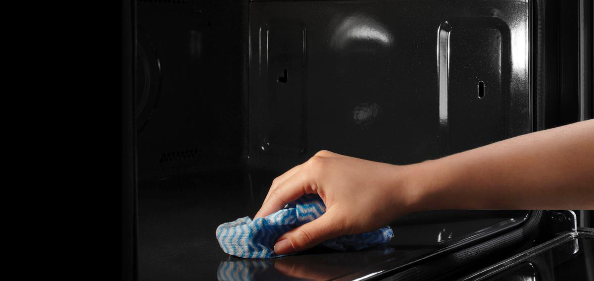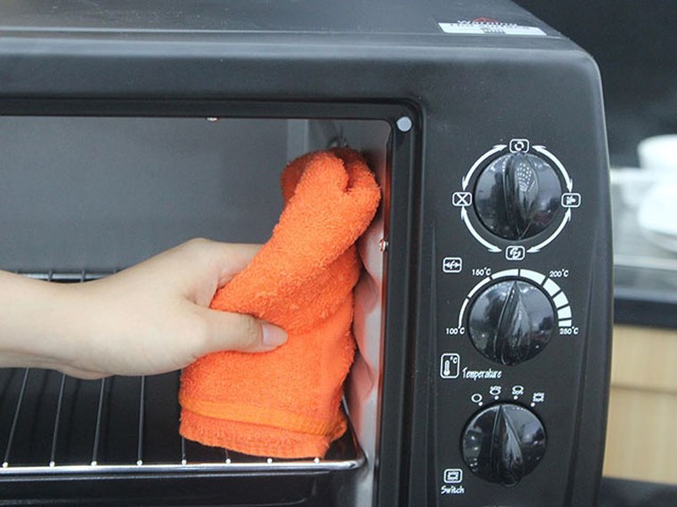 – Tắt lò đi, dùng giẻ lau sạch. Hơi nước cùng với độ ma sát của giẻ khi lau sẽ đánh tan các vết bẩn và khử mùi thức ăn còn xót lại.