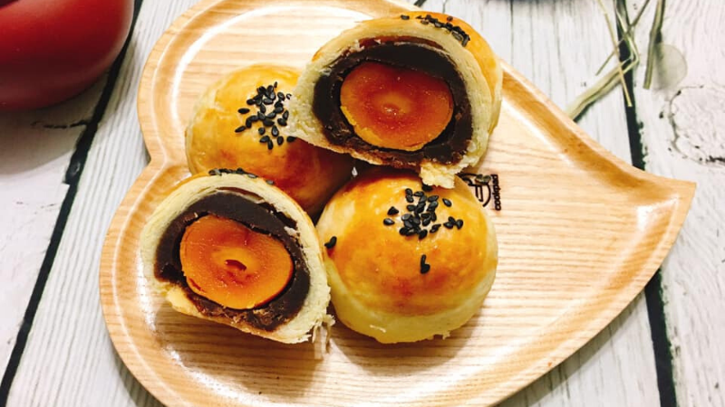 Cho bánh lên vỉ nướng, pha hỗn hợp quét mặt bánh gồm 1 lòng đỏ trứng gà với ít xì dầu. Sau đó rắc mè đen lên và đem nướng ở nhiệt độ 200 độ C trong 20 phút.