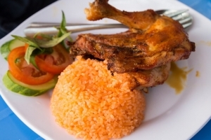 Lớp da ngoài vàng giòn óng ánh nhưng thịt gà lại mềm không bị khô, cơm ăn ngon no căng cả bụng là ...