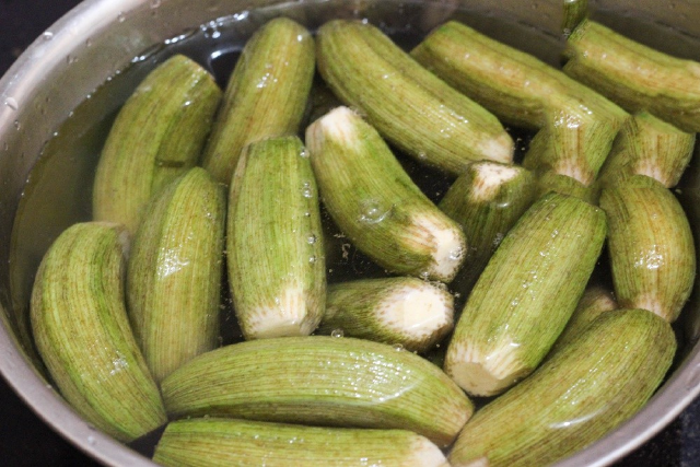 Đầu tiên bạn lột bỏ lớp vỏ xanh bên ngoài của chuối ngâm trong một chậu nước muối pha loãng để giúp chuối không bị thâm.