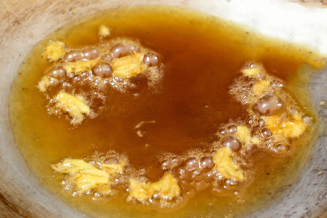 Tiếp theo bạn chế biến mạch nha bằng cách cho đường và một chút nước vào nồi đun nhỏ lửa để làm mạch nha. Khi hỗn hợp mạch nha chuyển màu cánh gián, bạn cho gừng giã nhỏ và một chút nước cốt chanh vào khuấy đều. Lượng đường này phụ thuộc vào số lượng chuối cũng như mức độ muốn ăn ngọt của bạn để điều chỉnh cho phù hợp.