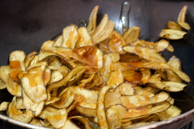 Khi mạch nha đã được chế biến xong thì đổ chuối vào, đảo đều nhanh tay cho đường mạch nha bám đều vào chuối.