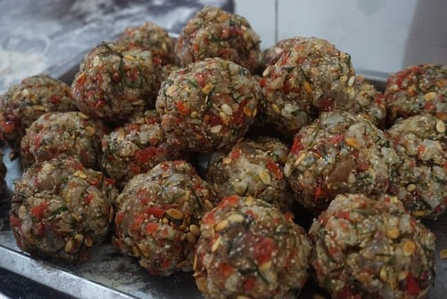 Nhân bánh trung thu thập cẩm có tính đặc thù là các loại nhân khô. Vì vậy chúng ta cần phải cho thêm một ít bột bánh dẻo để tạo sự kết dính cho các nguyên liệu làm nhân bánh. Nếu khi cho thêm bột bánh dẻo mà hỗn hợp nhân còn rời rạc thì hãy thêm chút bột bánh dẻo vào nữa nhé. Sau khi trộn xong nhân bánh chúng ta nắm hỗn hợp nhân bánh thành một viên tròn là đã đạt.