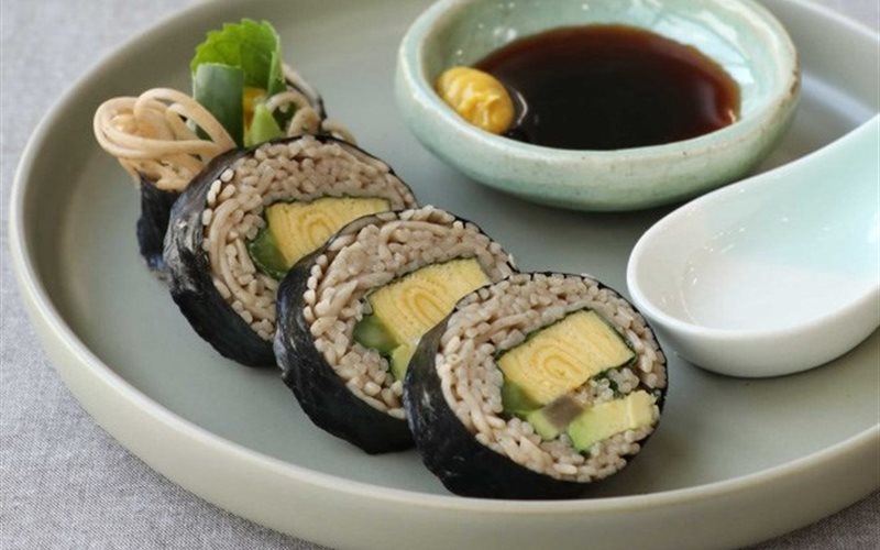 Đặt mành tre lên thớt, đặt lá rong biển lên trên sau đó thêm lá tía tô, dưa chuột, trứng chiên, quả bơ. Cuộn tròn lại như sushi.