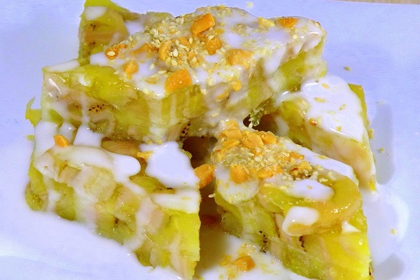 Bước 4: Lấy nước cốt dừa pha với 1 bát nước, đường và 2 thìa bột năng. Bắc nồi lên bếp và đun hỗn hợp đến khi đặc sánh lại. Bánh chuối hấp sau khi chín lấy ra khỏi khuôn và ăn kèm cùng nước cốt dừa. Rắc thêm trên bề mặt chút vừng rang, lạc rang sẽ làm món ăn trở nên hoàn hảo hơn.