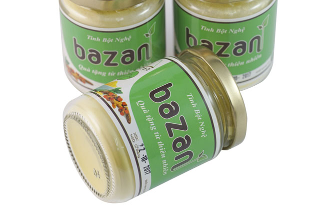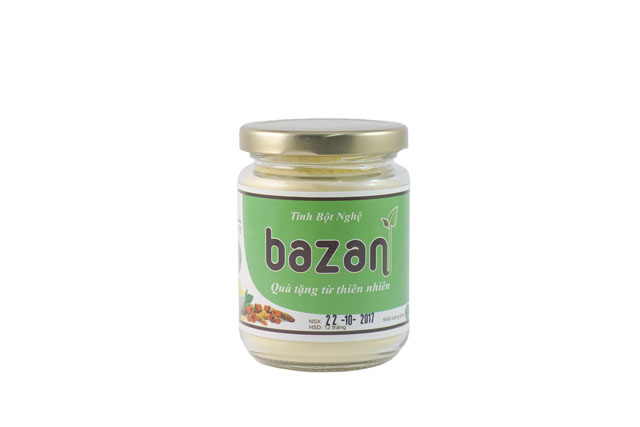 Tinh bột nghệ Bazan 100g là một dạng của bột nghệ sau khi đã loại bỏ hoàn toàn tinh dầu. Sản phẩm có màu vàng tươi, thoang thoảng mùi thơm của nghệ cứ không hắc nồng như nghệ nguyên chất. Để chế biến ra loại tinh bột nghệ Bazan 100g, các củ nghệ tươi sau khi được sơ chế sẽ được thái mỏng, phơi và sấy khô ép lấy hết dầu và nghiền nhuyễn thành dạng bột.